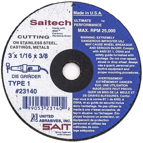 Sait Abrasive Cutoff Discs or Saitech Mini Abrasive Cutoff Discs or Whiz Wheels 3 or 4 inch diameter in 1/16 inch thickness for longer life or .035 inch thickness for faster cut.